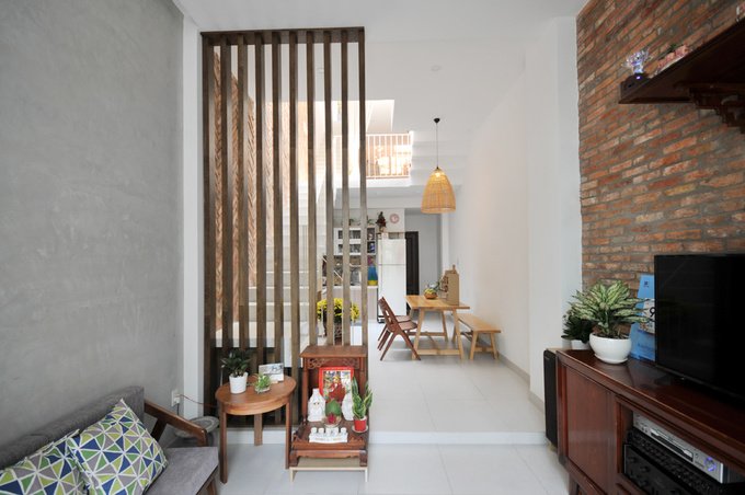 Ngôi nhà ống có kinh phí xây dựng thấp (680 triệu đồng), tận dụng lại nhiều đồ dùng cũ. Nhưng nơi ở này được gia chủ chăm chút từng chi tiết. Hai vợ chồng cẩn thận bày trí bếp, kệ tivi; ông Bảnh tự tay đóng cái kê chân bàn thờ ông Địa.